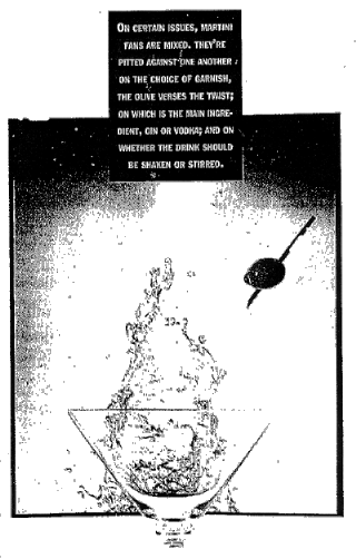 Finally, there's the unmartini. Bereft of gin and vodka, the Hennessy Martini is cognac with lemon juice. Delicious--but is it a martini? Is Seagram's and lemon a Canadian Martini, or Canatini? Is there a Bourbon Martini? Hard to say, actually, because perfect martinis include style and attitude as key ingredients. So maybe tossing an olive in your beer makes a Malt Martini--if it tastes like a cold cloud.
