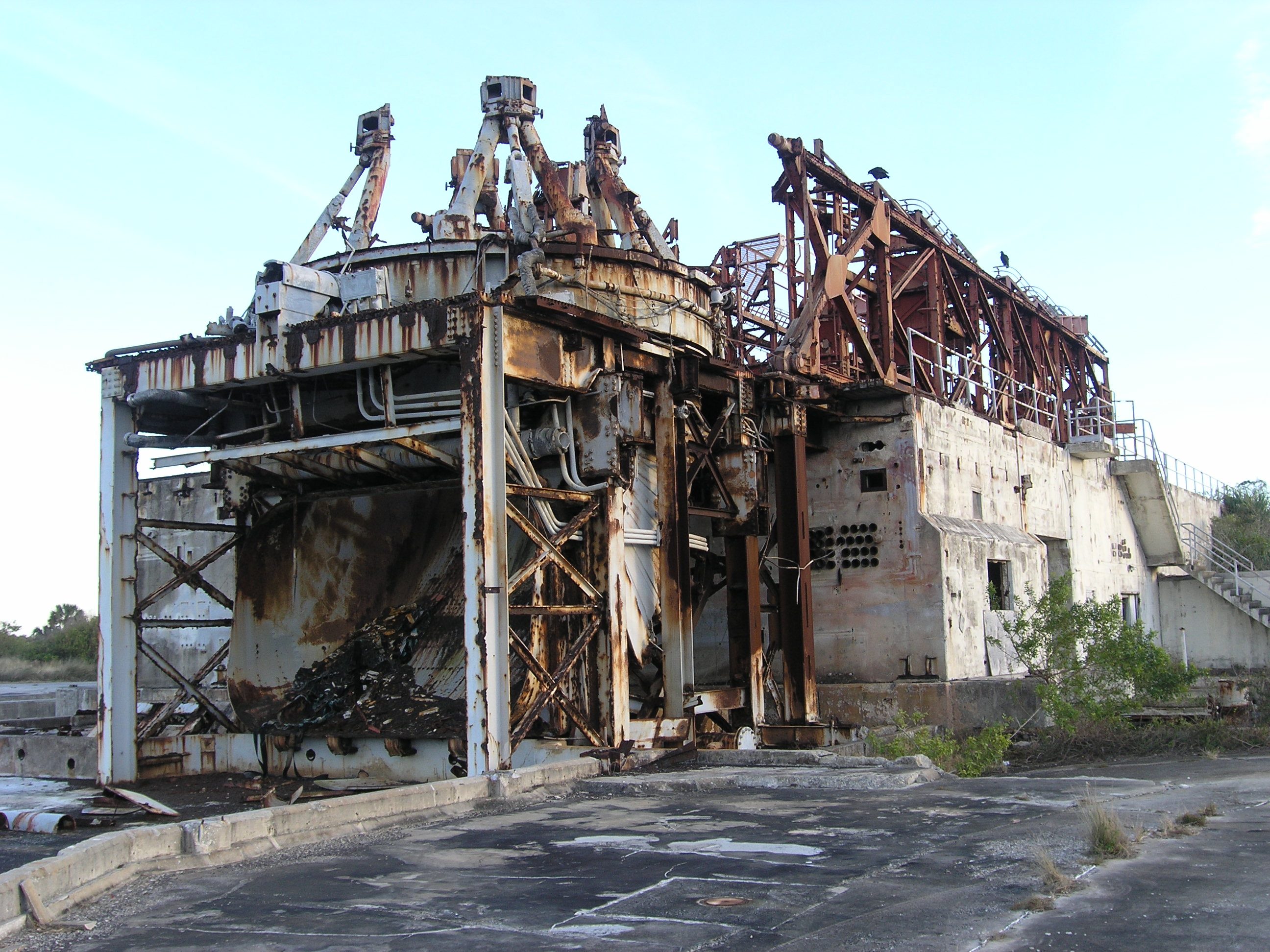 The gantry, to the upper right, would lift to a vertical position to allow access to the rocket.